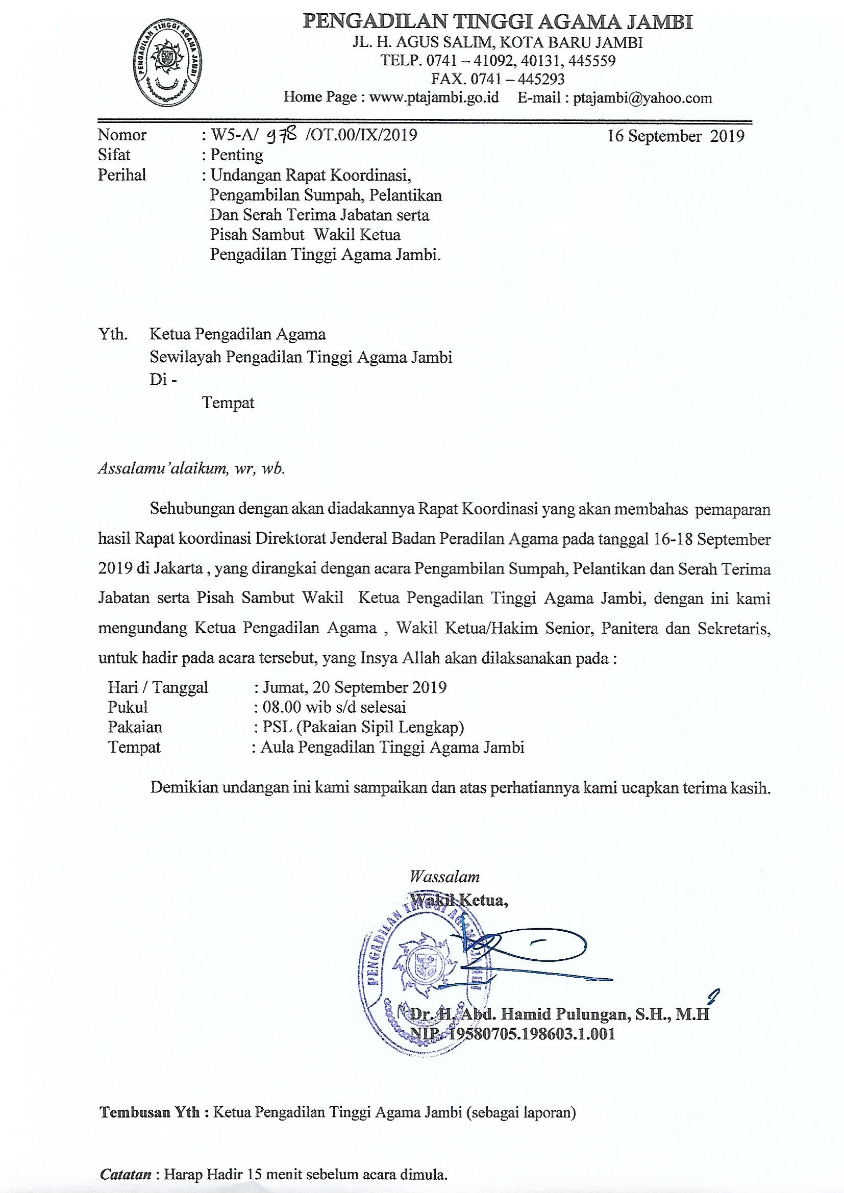 Berikut kami lampirkan Undangan Rapat Koordinasi, Pengambilan Sumpah, Pelantikan dan Serah Terima Jabatan serta Pisah Sambut Wakil Ketua Pengadilan Tinggi Agama Jambi, sebagaimana berikut ...